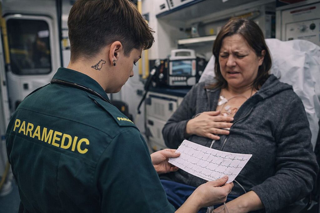 Ao chegar ao local, após avaliá-la, eu mesma realizei o eletrocardiograma. Foi ali, analisando o traçado diante de mim, que identifiquei alterações compatíveis com infarto agudo do miocárdio já em curso.